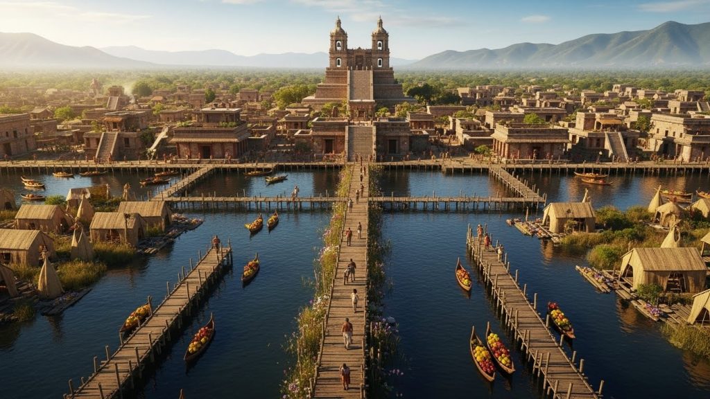 This city, due to its structure, its system, and its beauty, was one of the oldest and most amazing cities in the world. It had floating fields that were made with mud and the roots and reeds present in the lake, and in which corn, beans, tomatoes, and green and red chilies were cultivated. Whole islands were made of mud and roots, canals were built, in which boats plied like urban transport. To connect the city with the surrounding land, i.e., the mainland, there were three large wooden bridges around which boats carrying beautiful fruits and fresh vegetables floated. And also those boats in which they used to sit and hunt fish and water birds.
