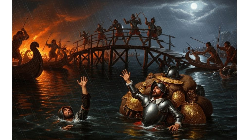 Now, from here on, I’m skipping some small incidents, which are not so important to know. But in short, what happened was that the king invited Cortés inside the pyramid. But when he went there and saw the gold there, the Spanish soldiers couldn’t hold back. They arrested King Montezuma and started looting the gold in the pyramid. Because they thought that we would kill these wild people and leave from here. But when people found out that the king had been arrested, the situation in the city started to get worse. People from outside started throwing stones. And the Spaniards realized that we, a few hundred soldiers, would not be able to fight with these thousands of people. So we have to get out of here overnight.