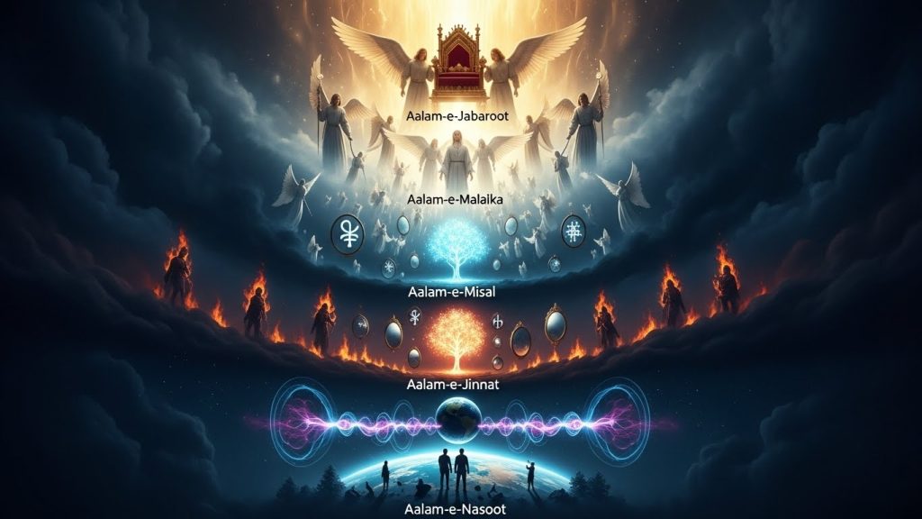 Then Aalam-e-Jinnat. Which is a world more powerful than us. But not complete dominance. Rather, there are limits for them too, which protect others from them. And this world is a reflection. Of Allah’s attribute Ya Qahhar (The Subduer) and Ya Hafiz (The Protector). Meaning, Jinns, who are an extremely powerful creation, yet Allah alone provides protection from them.